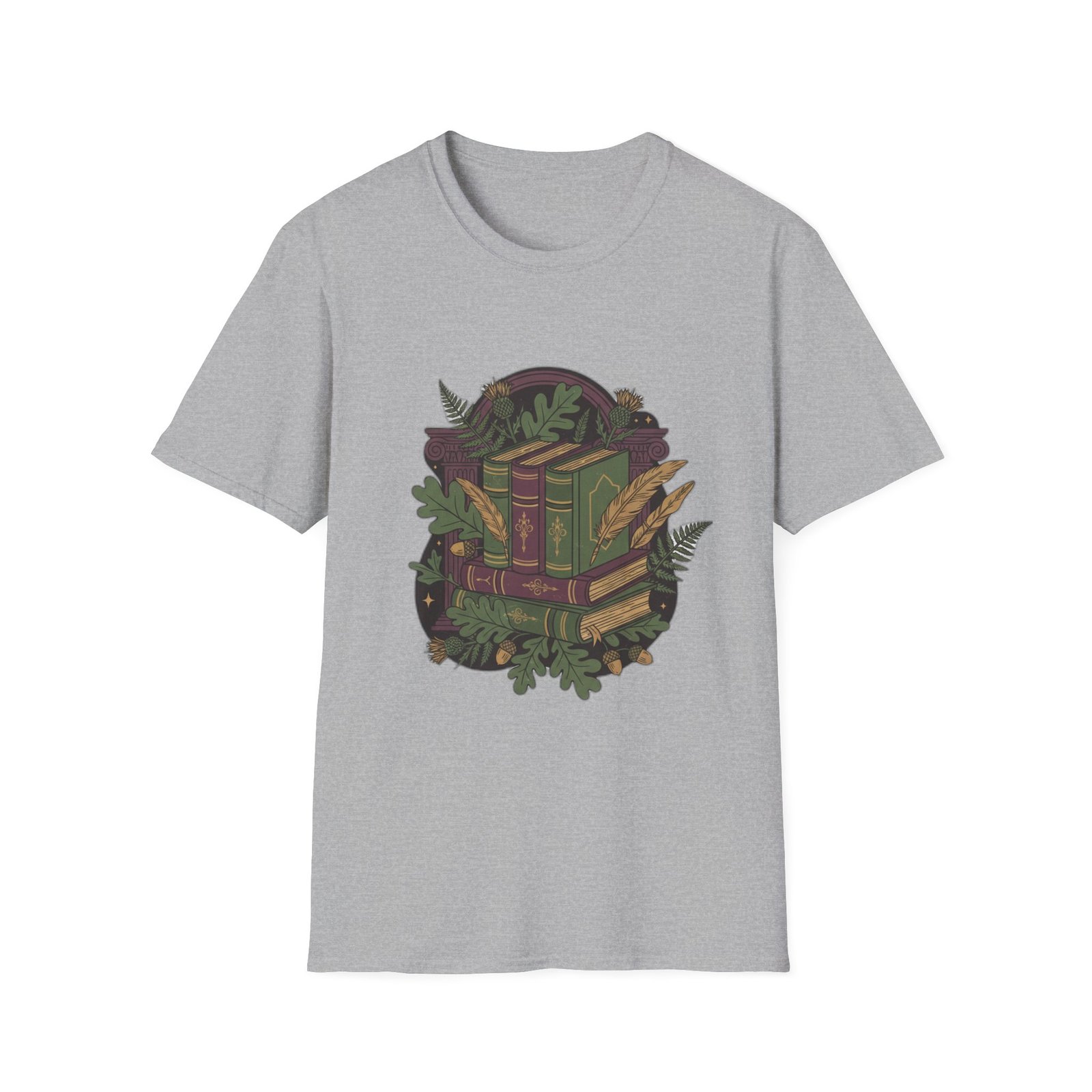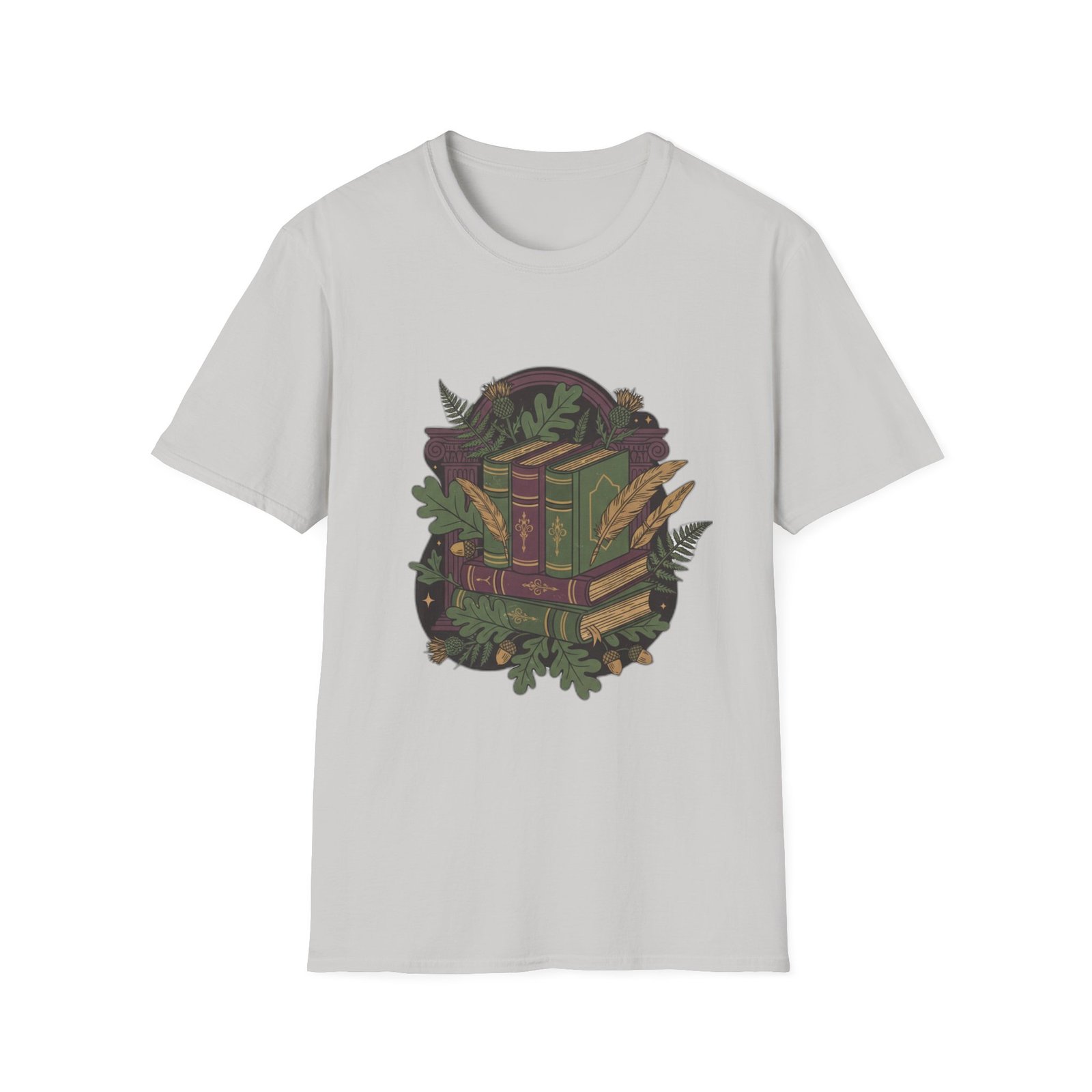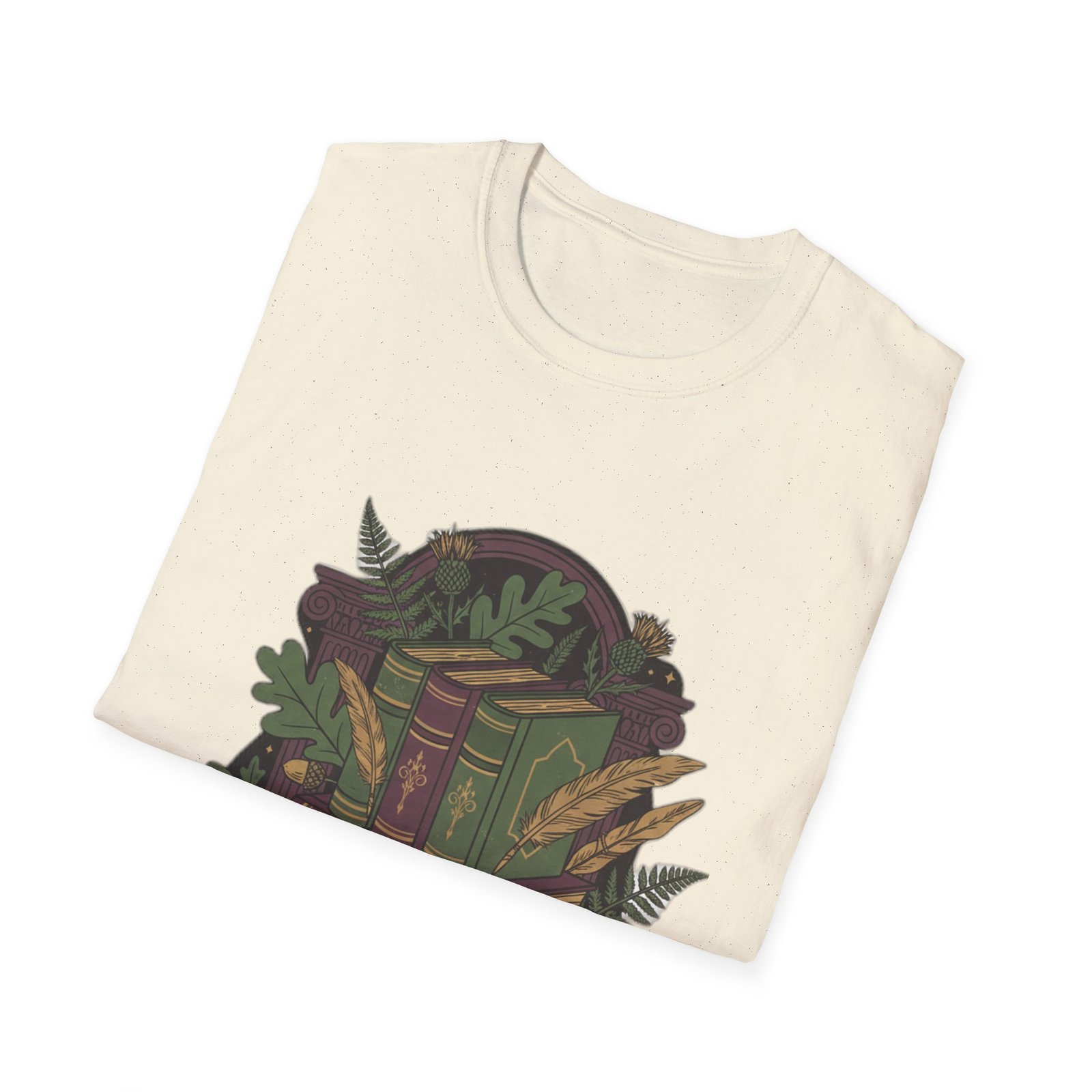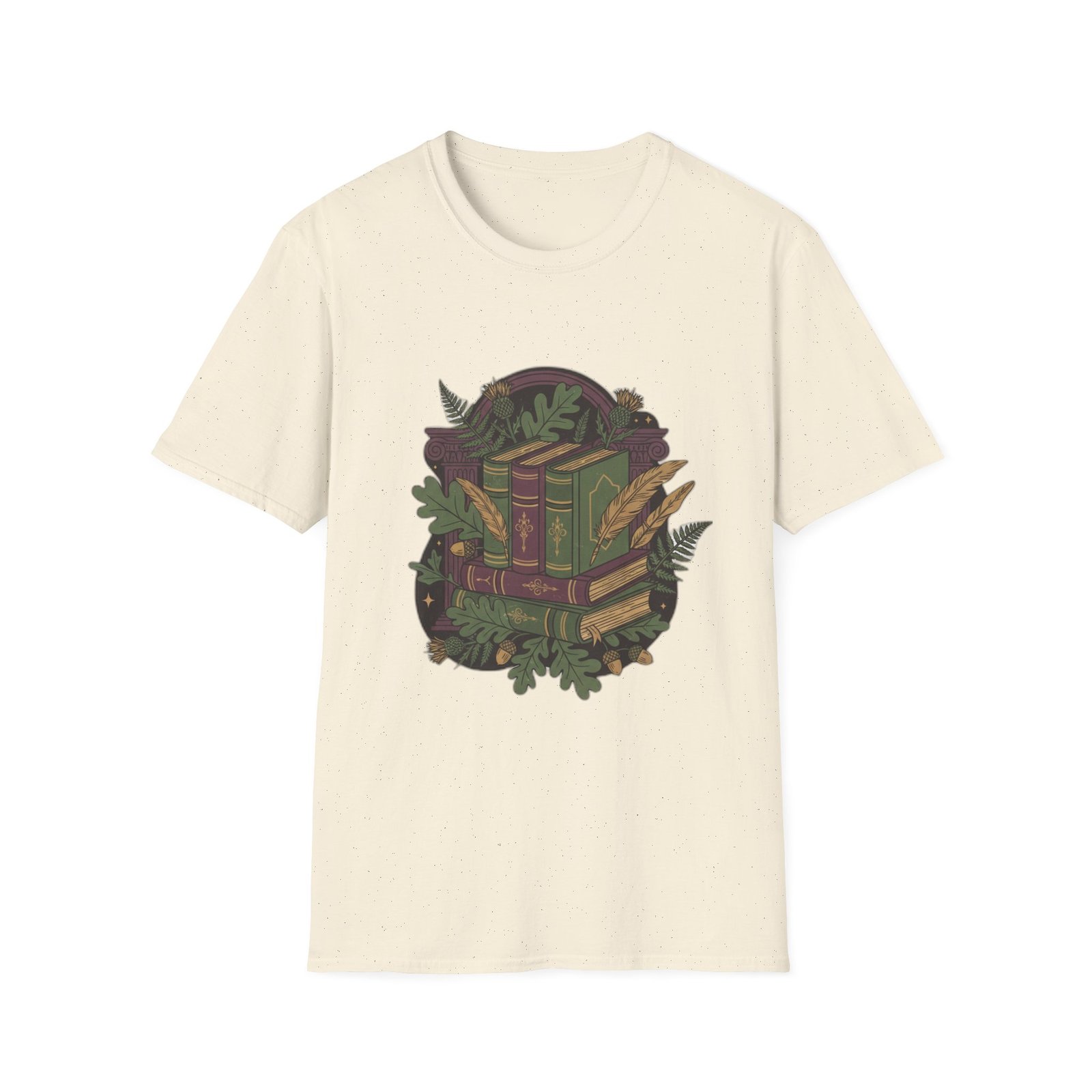 This lightweight cotton tee carries a cozy, storybook vibe—soft against skin and illustrated with a stack of vintage books wrapped in leafy vines and tiny woodland details. Wear it during slow mornings with coffee, tucked into a favorite cardigan for library runs, or layered under a jacket for brisk autumn walks. The muted, earthy palette and detailed linework feel like a secret for fellow book lovers; it invites quiet conversation and the kind of comfort that comes from turning pages and lingering in margins.