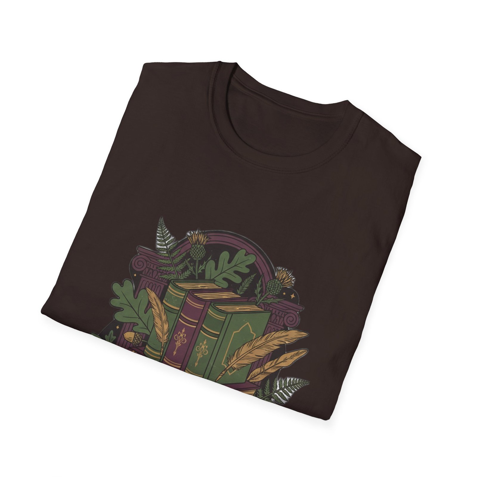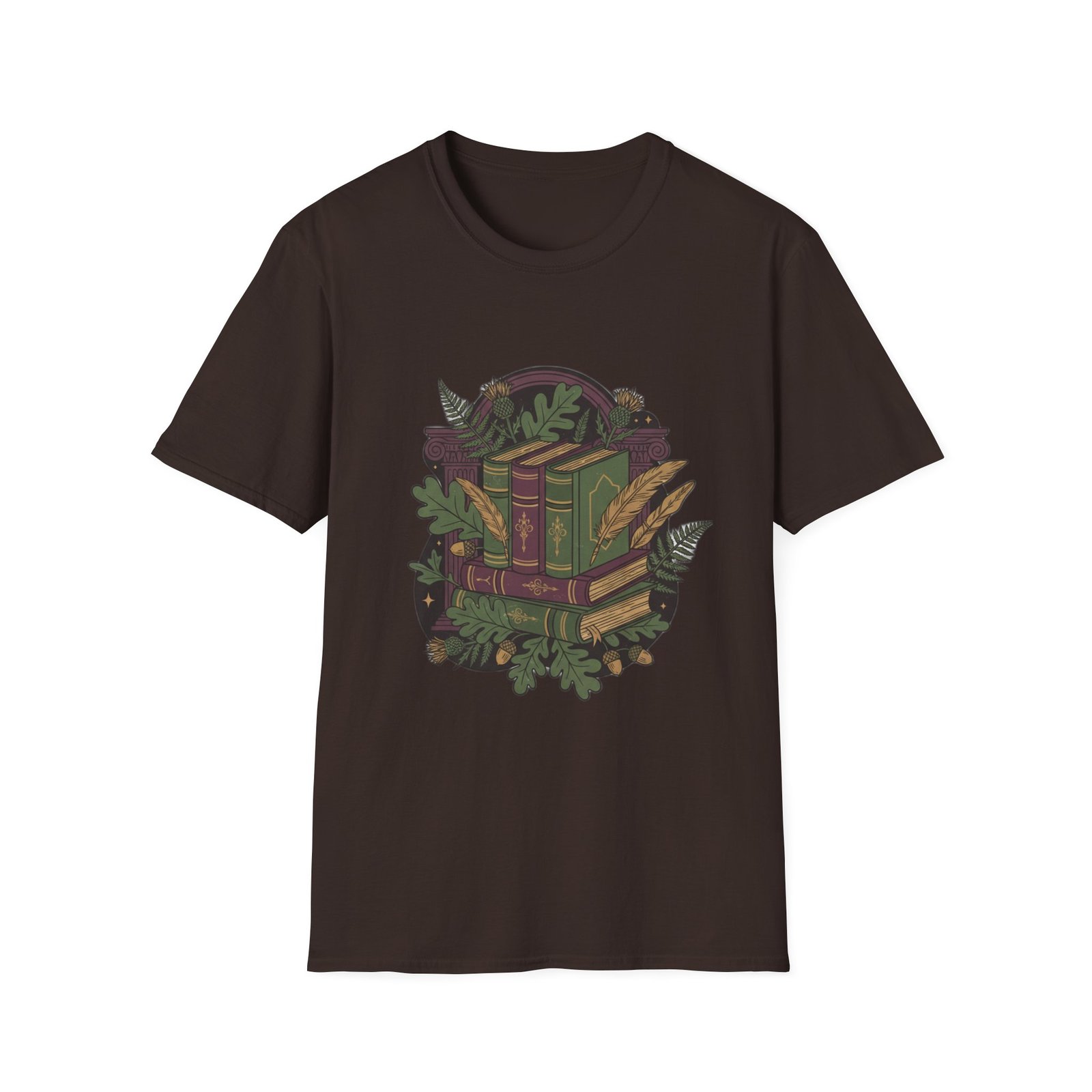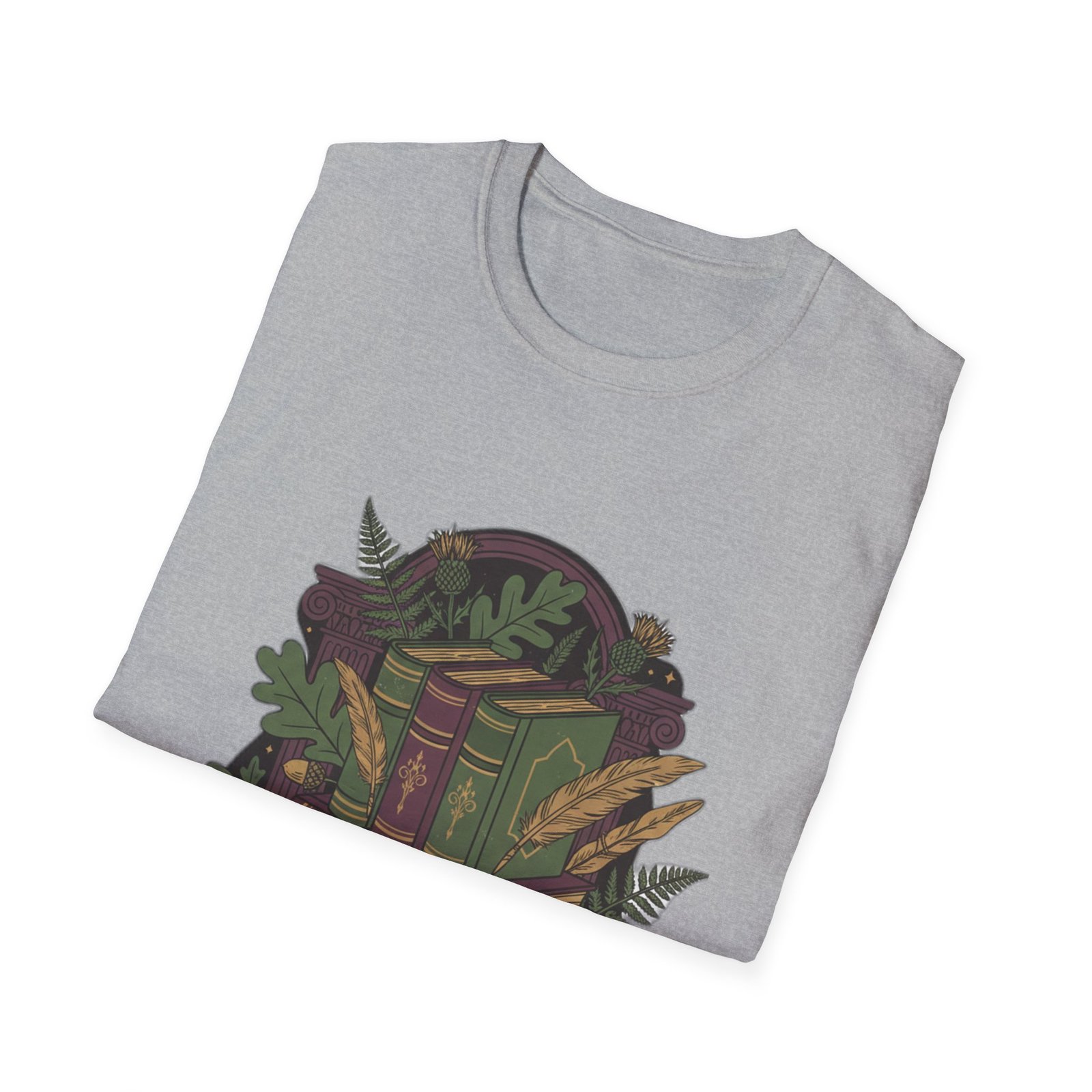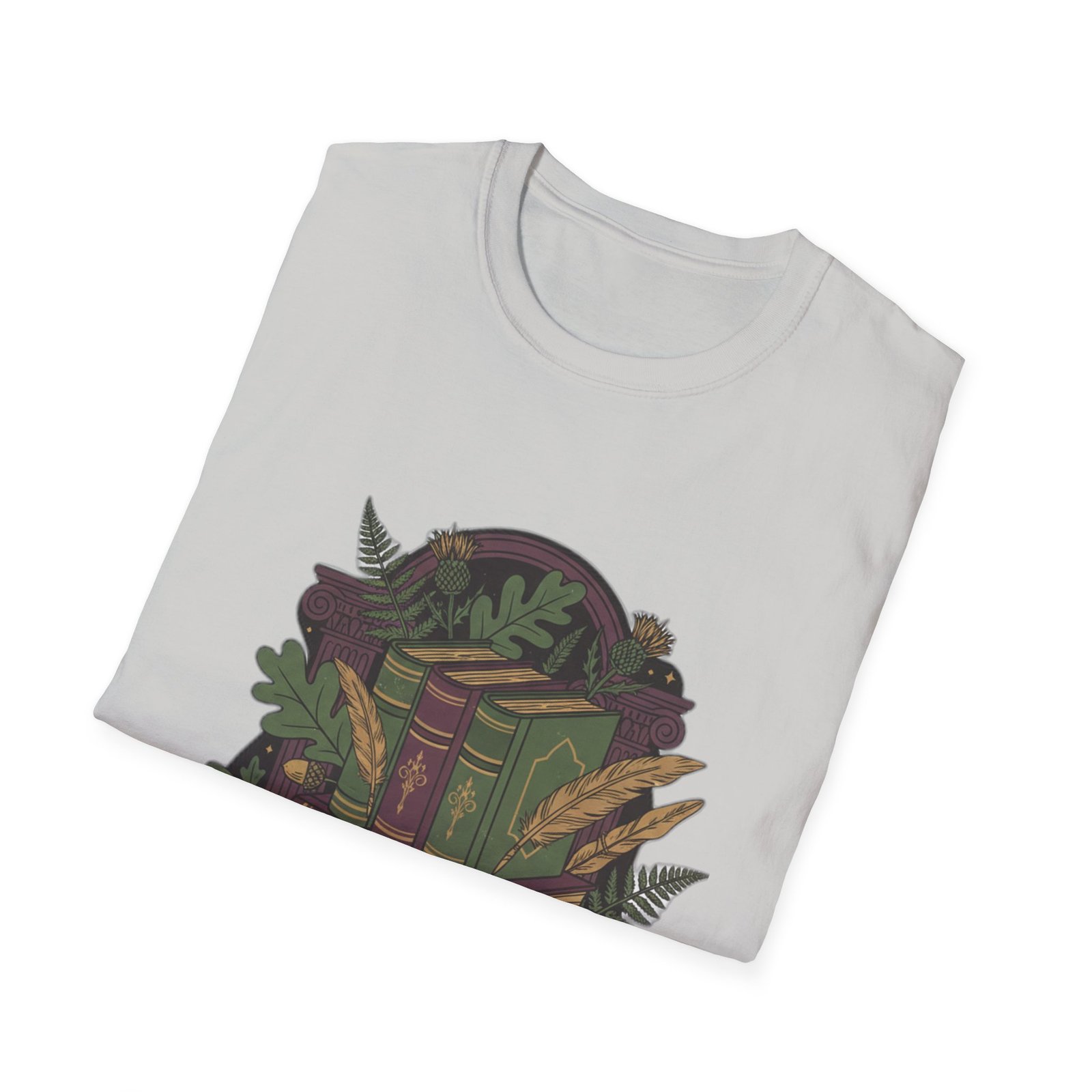 This lightweight cotton tee carries a cozy, storybook vibe—soft against skin and illustrated with a stack of vintage books wrapped in leafy vines and tiny woodland details. Wear it during slow mornings with coffee, tucked into a favorite cardigan for library runs, or layered under a jacket for brisk autumn walks. The muted, earthy palette and detailed linework feel like a secret for fellow book lovers; it invites quiet conversation and the kind of comfort that comes from turning pages and lingering in margins.