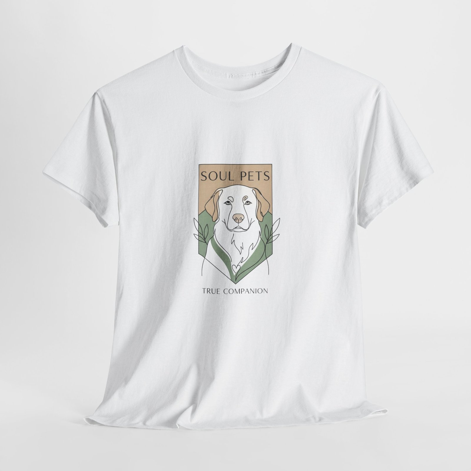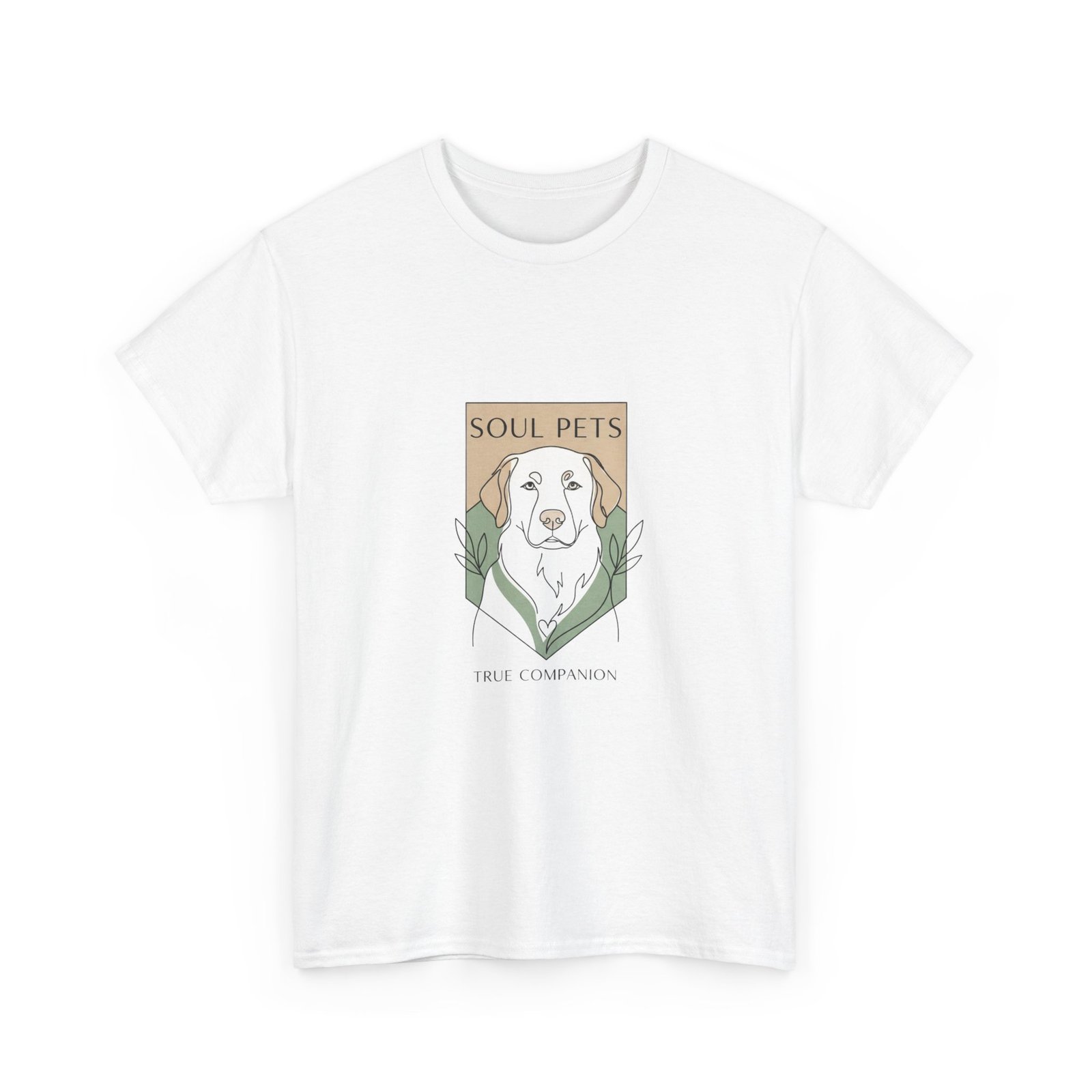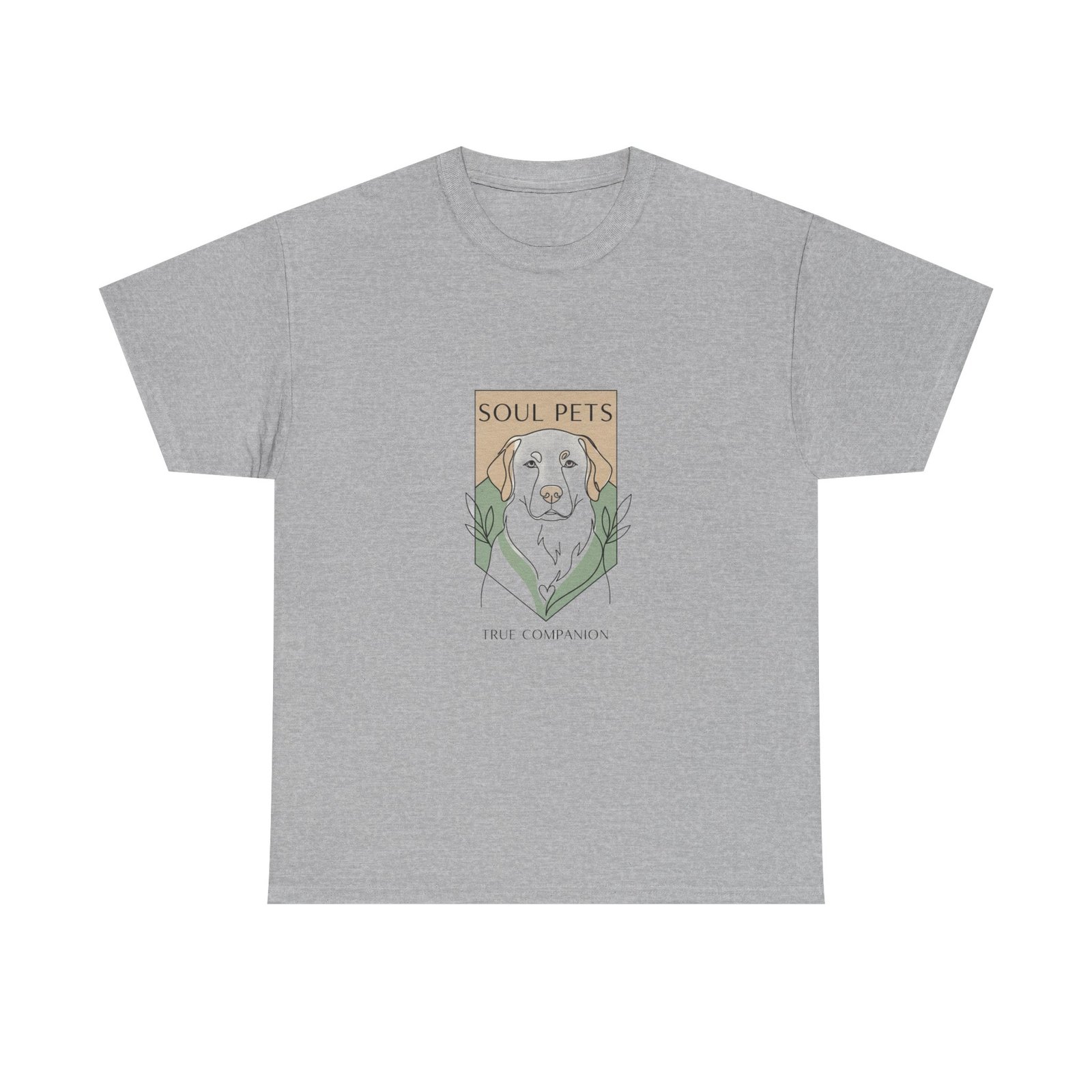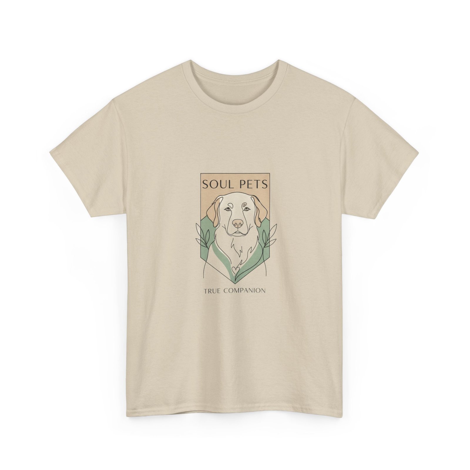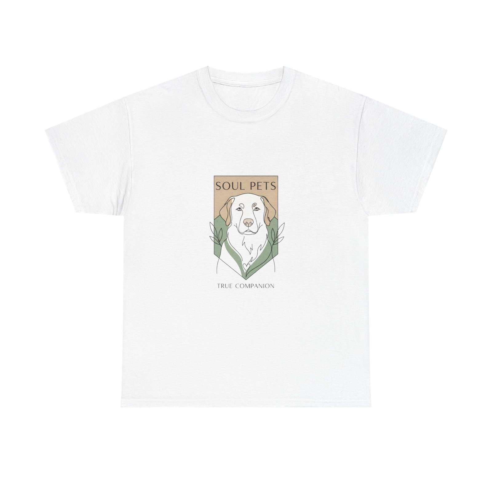 This soft, durable tee carries a quiet, heartfelt design for people who see their animals as companions of the soul. The centered illustration frames a gentle dog portrait with earthy greens and warm beige tones, surrounded by minimalist botanical lines.