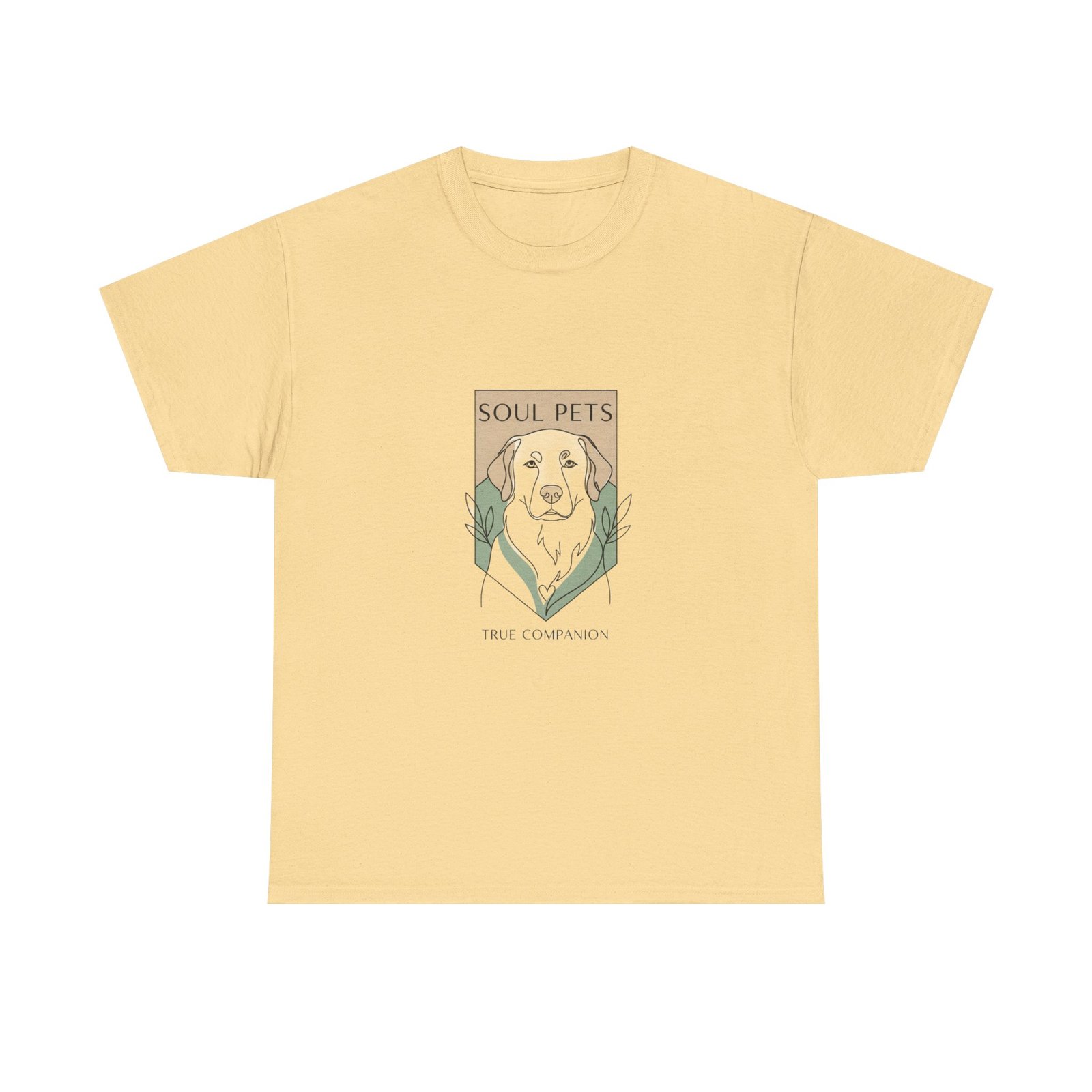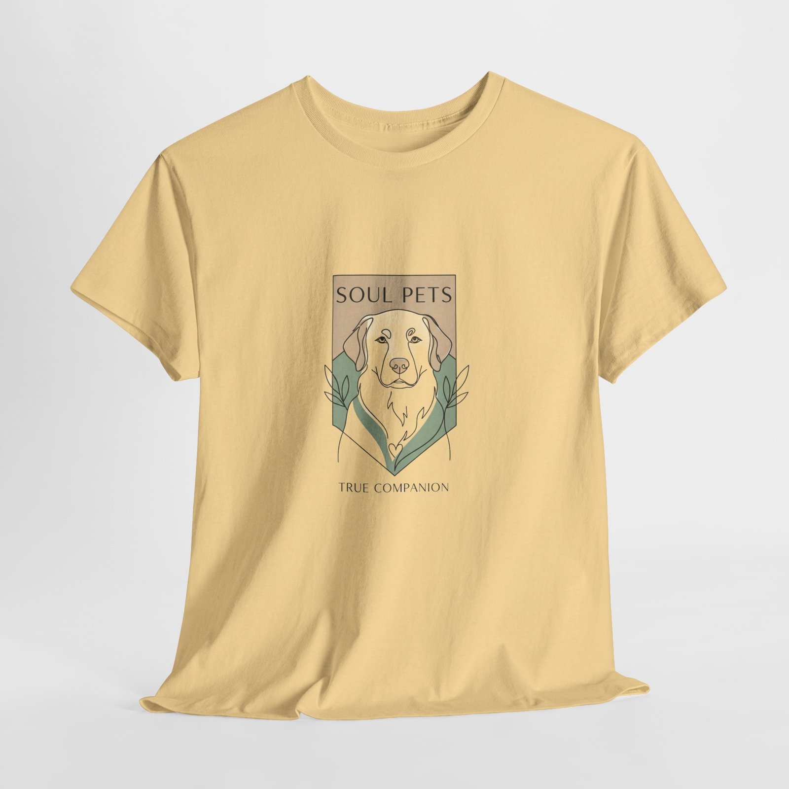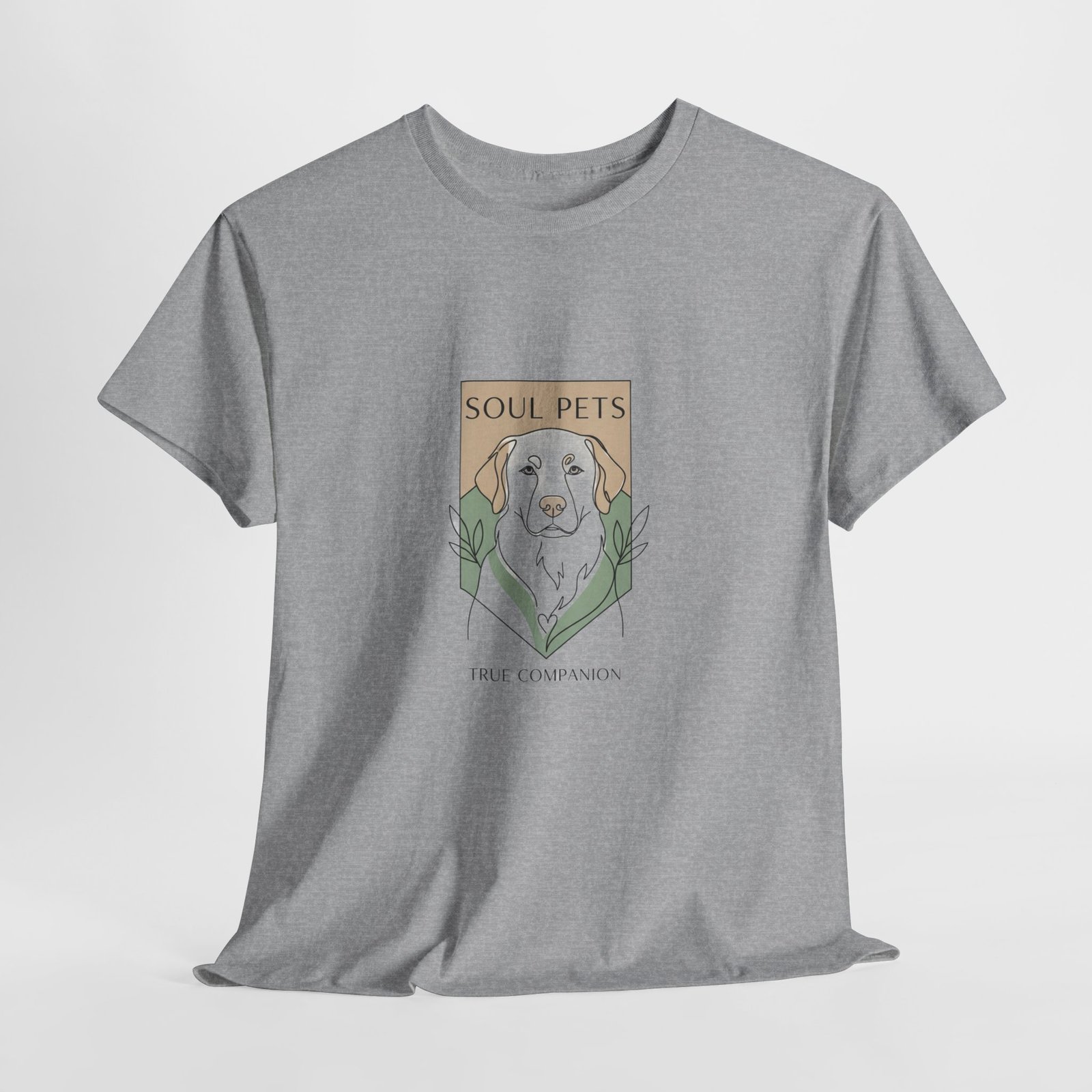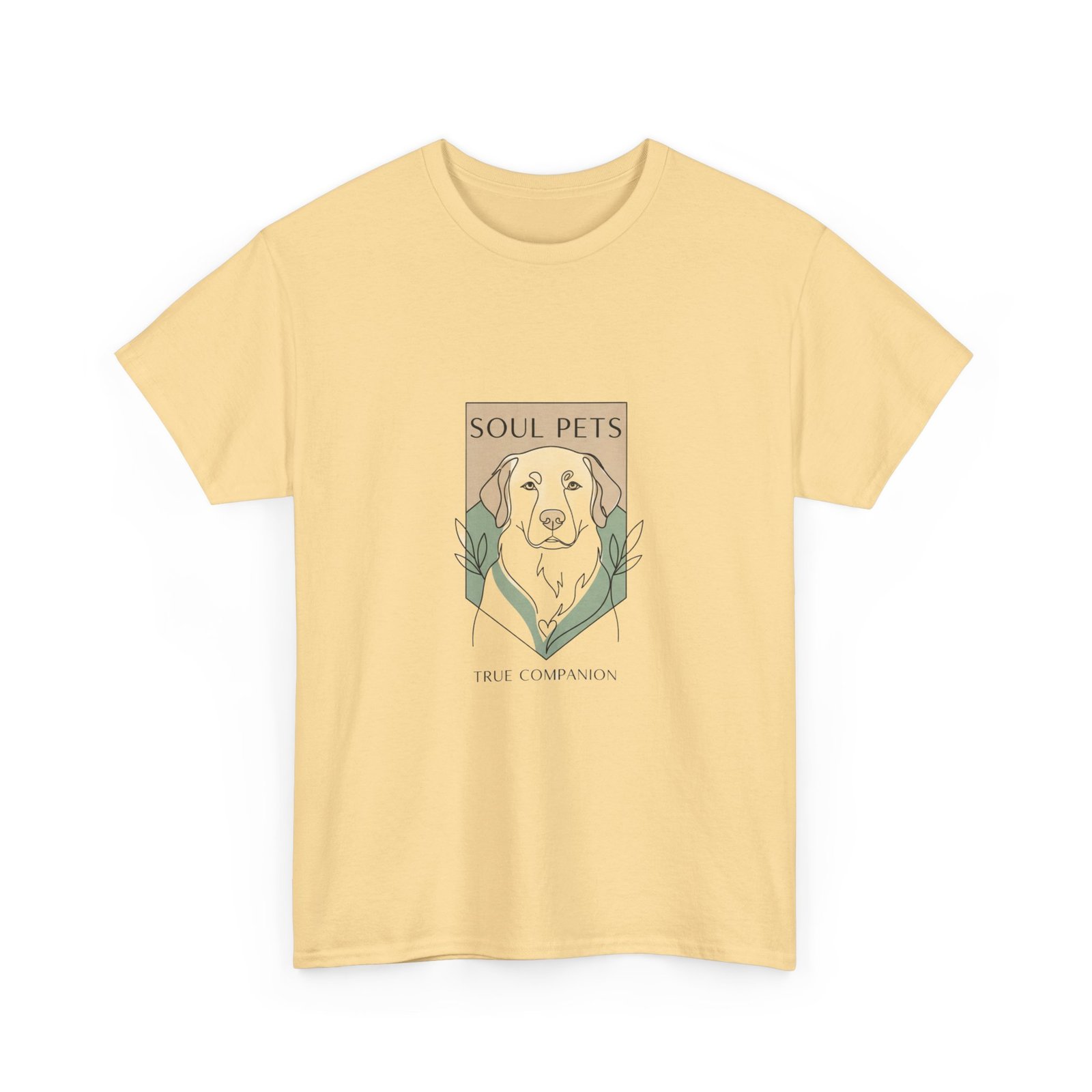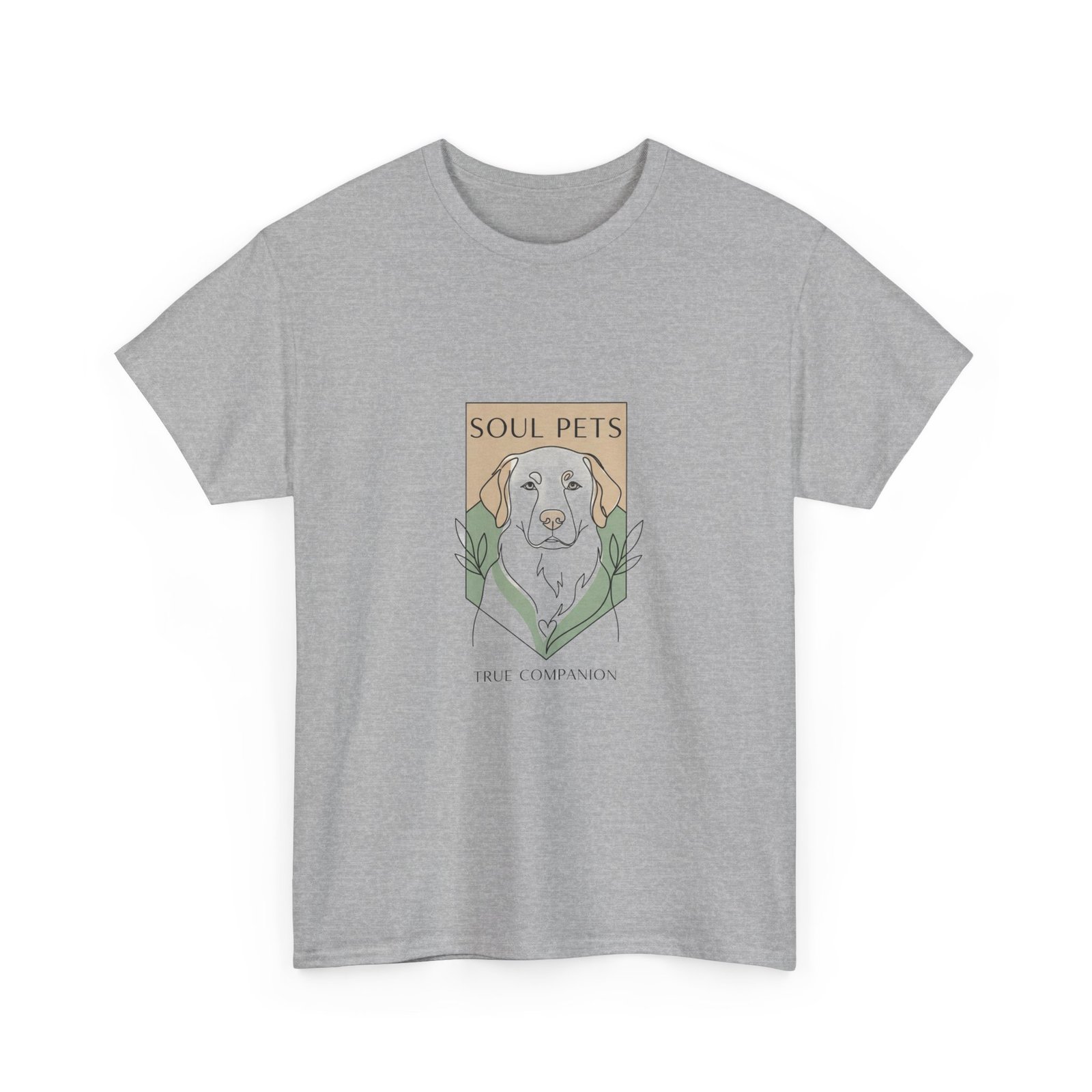 This soft, durable tee carries a quiet, heartfelt design for people who see their animals as companions of the soul. The centered illustration frames a gentle dog portrait with earthy greens and warm beige tones, surrounded by minimalist botanical lines.